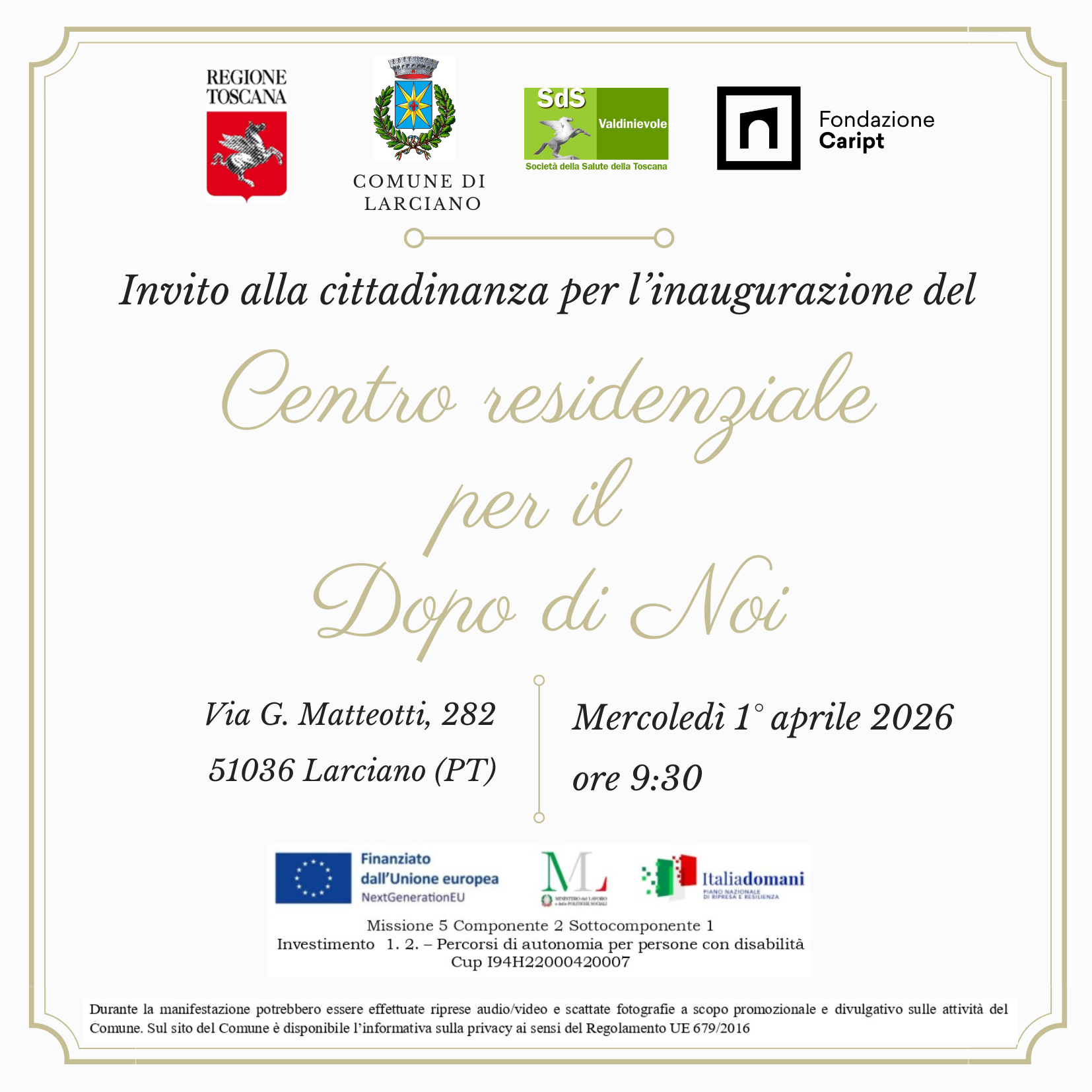 La cittadinanza è invitata mercoledì 1° aprile 2026 alle ore 9:30 all'inaugurazione del nuovo centro residenziale per il “Dopo di noi”.