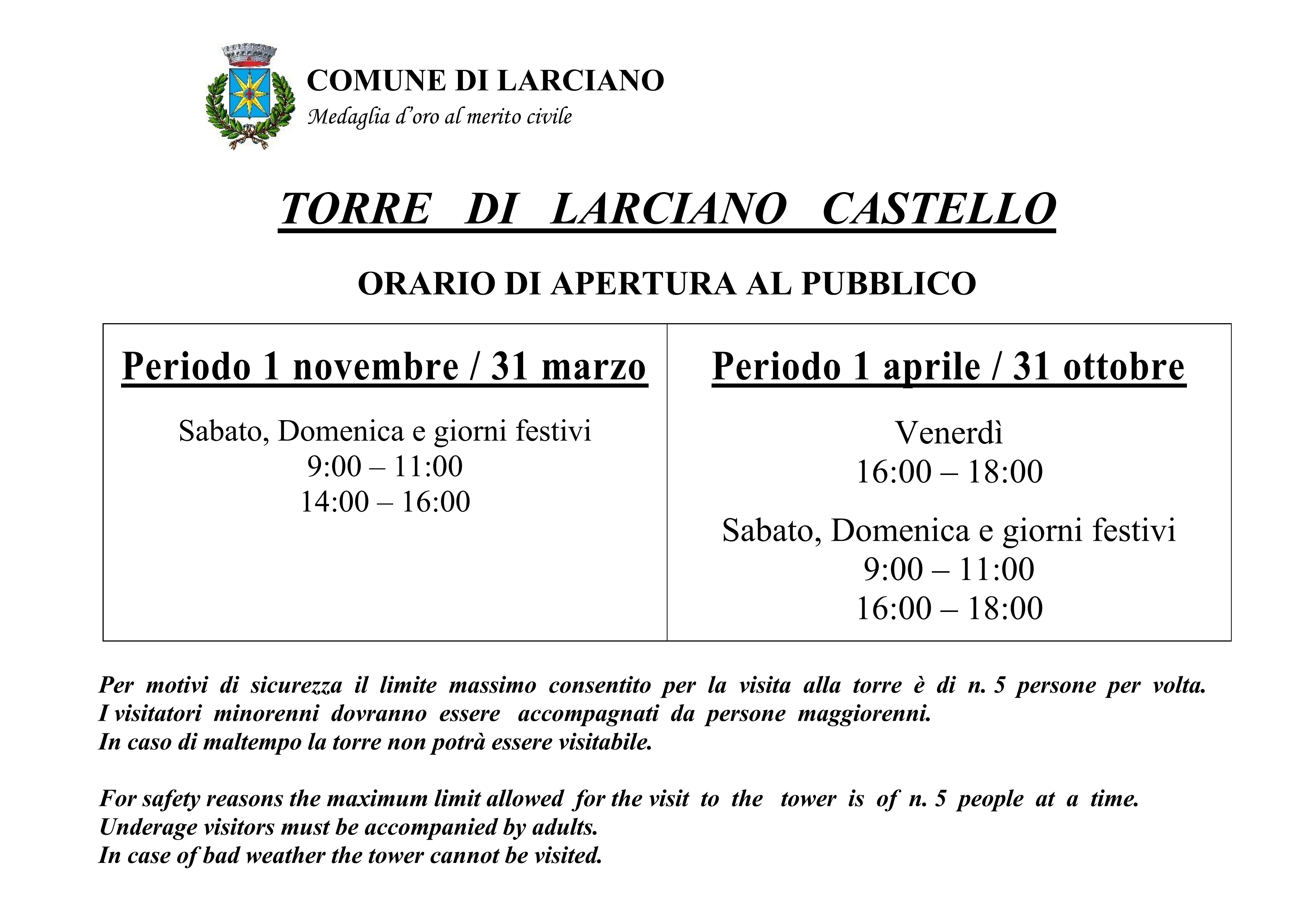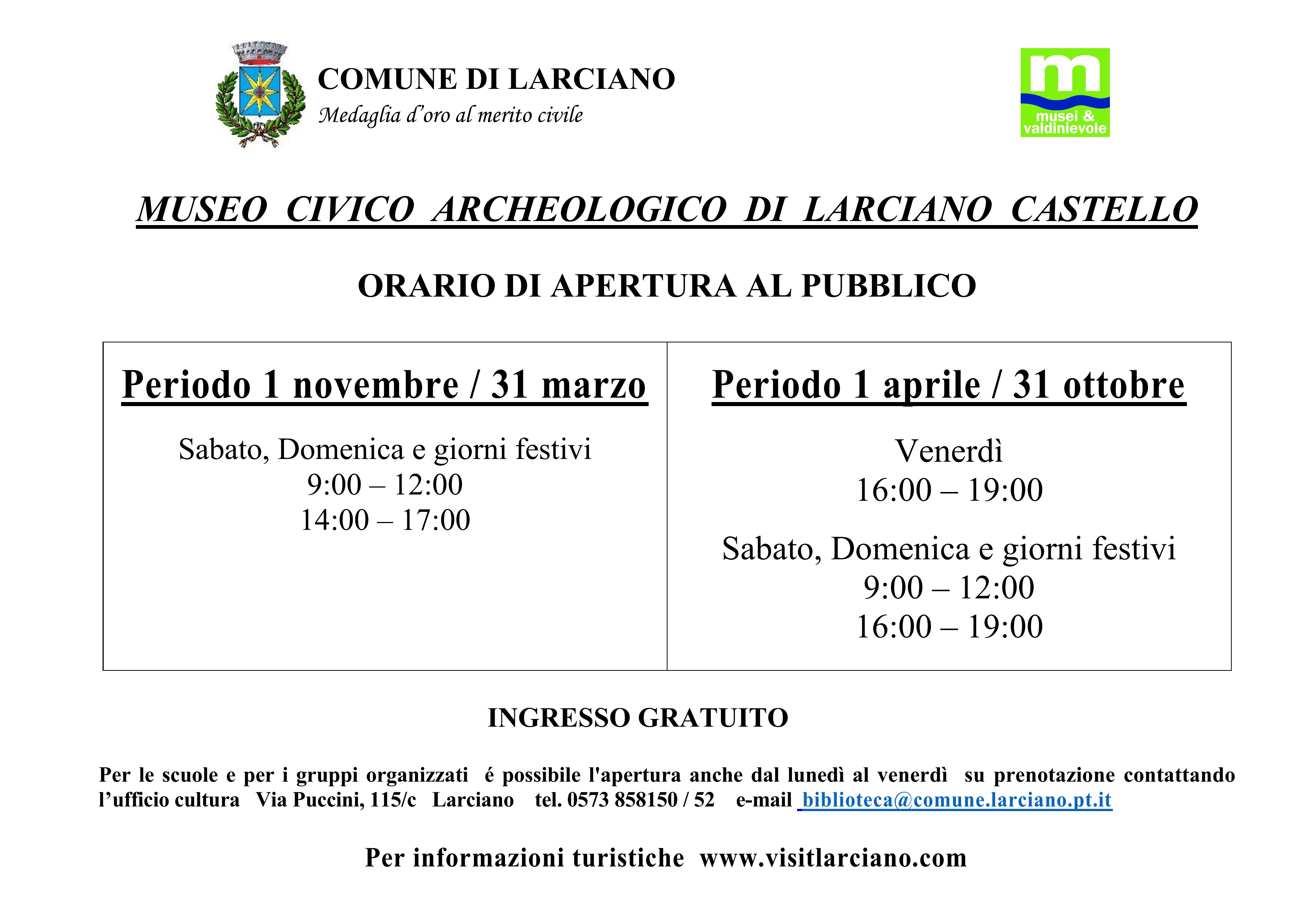 Da venerdì 3 aprile il Museo Civico Archeologico e la torre di Larciano Castello saranno regolarmente aperti con il seguente orario: